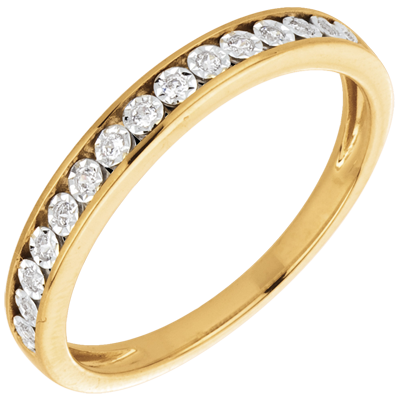 This yellow gold eternity ring has a white gold setting around the diamonds which amplifies the brilliance of the multi stone jewellery.15 Diamonds : 0.09 carat - Yellow gold (18K Gold = 750/-): 2.05 g. 15 diamonds : 0.09 carat - Yellow gold (18K Gold = 750/-): 1.9 g. More dimensions