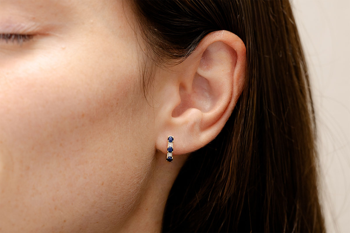 Classic and timeless half hoop Creole earrings combining gold, with diamonds and sapphire .