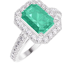 Ring White gold 18 carats - Synthetic emerald Baguette 1 Carats - Halo Lab-grown diamond - Setting Lab-grown diamond
