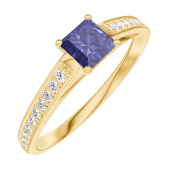 Ring Yellow gold 9 carats - Blue Sapphire Princess 0.3 Carats - Setting Diamond white