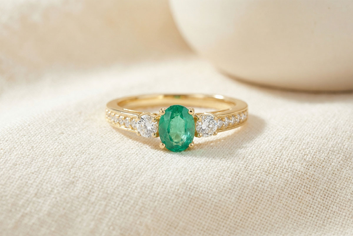« L'ATELIER » NO. 162125Ring Yellow gold 18 carats - Emerald Oval 0.3 Carats - Ring settings Diamond white - Setting Diamond white 5