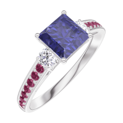 Ring White gold 18 carats - Blue Sapphire Princess 0.7 Carats - Ring settings Diamond white - Setting Ruby