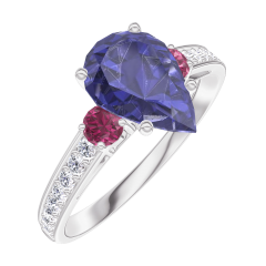 Ring White gold 9 carats - Blue Sapphire Pear 1 Carats - Ring settings Ruby - Setting Diamond white