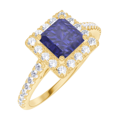 Ring Yellow gold 9 carats - Blue Sapphire Princess 0.5 Carats - Halo Diamond white - Setting Diamond white