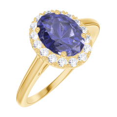 Ring Yellow gold 9 carats - Blue Sapphire Oval 0.5 Carats - Halo Diamond white