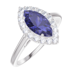 Ring White gold 9 carats - Blue Sapphire Marquise 0.5 Carats - Halo Diamond white