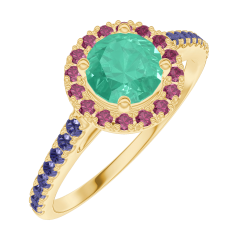 « L'ATELIER » NO. 170894Ring Yellow gold 9 carats - Emerald round 0.5 Carats - Halo Ruby - Setting Blue Sapphire 5