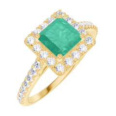 Ring Yellow gold 9 carats - Emerald Princess 0.5 Carats - Halo Diamond white - Setting Diamond white