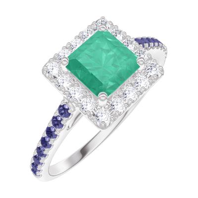 « L'ATELIER » Nº170928Ring White gold 9 carats - Emerald Princess 0.5 Carats - Halo Diamond white - Setting Blue Sapphire 4.6