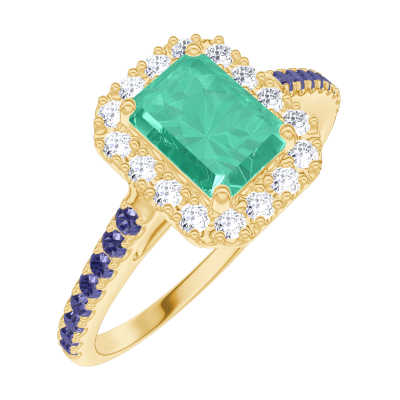 « L'ATELIER » Nº170973Ring Yellow gold 18 carats - Emerald Baguette 0.5 Carats - Halo Diamond white - Setting Blue Sapphire 4.9