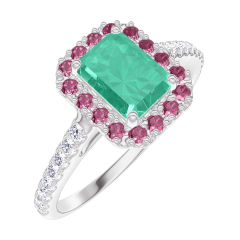 Ring White gold 9 carats - Emerald Baguette 0.5 Carats - Halo Ruby - Setting Diamond white