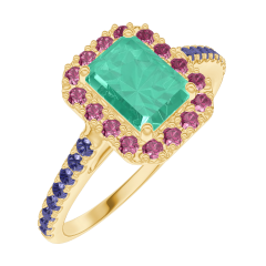 Ring Yellow gold 18 carats - Emerald Baguette 0.5 Carats - Halo Ruby - Setting Blue Sapphire