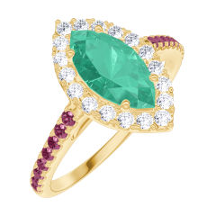 Ring Yellow gold 9 carats - Emerald Marquise 0.5 Carats - Halo Diamond white - Setting Ruby
