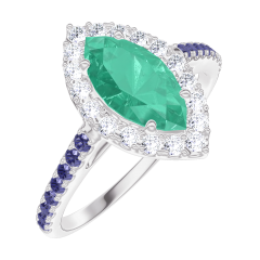 Ring White gold 9 carats - Emerald Marquise 0.5 Carats - Halo Diamond white - Setting Blue Sapphire