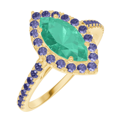 Ring Yellow gold 18 carats - Emerald Marquise 0.5 Carats - Halo Blue Sapphire - Setting Blue Sapphire
