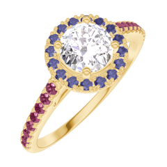 Ring Yellow gold 9 carats - Lab-grown diamond Round 0.5 Carats - Halo Blue Sapphire - Setting Ruby