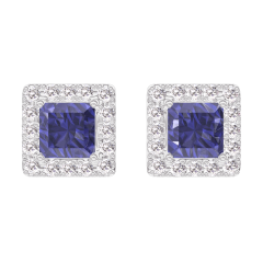 Earrings White gold 18 carats - Blue Sapphire Princess 0.3 Carats (2 X) - Halo Diamond white