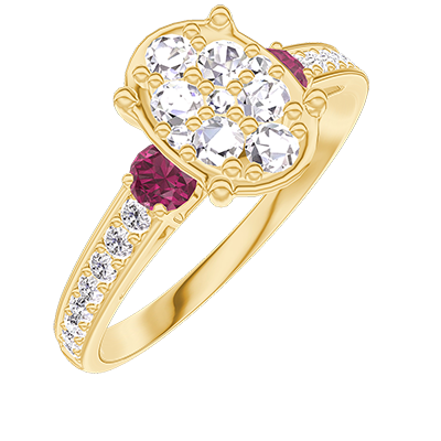 « L'ATELIER » NO. 211146Ring Yellow gold 9 carats - Cluster of natural diamonds Oval equivalent 1 - Ring settings Ruby - Setting Diamond white 4.8