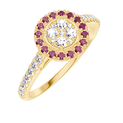 « L'ATELIER » NO. 211422Ring Yellow gold 9 carats - Cluster of natural diamonds round equivalent 0.5 - Halo Ruby - Setting Diamond white 5
