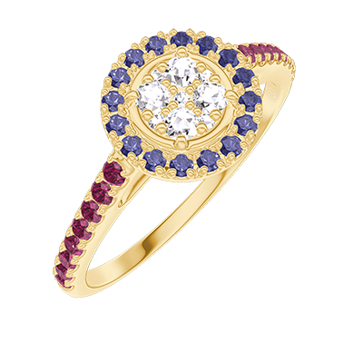 « L'ATELIER » Nº211441Ring Yellow gold 18 carats - Cluster of natural diamonds round equivalent 0.5 - Halo Blue Sapphire - Setting Ruby 5