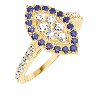 « L'ATELIER » Nº211677Ring Yellow gold 18 carats - Cluster of natural diamonds Marquise equivalent 0.5 - Halo Blue Sapphire - Setting Diamond white