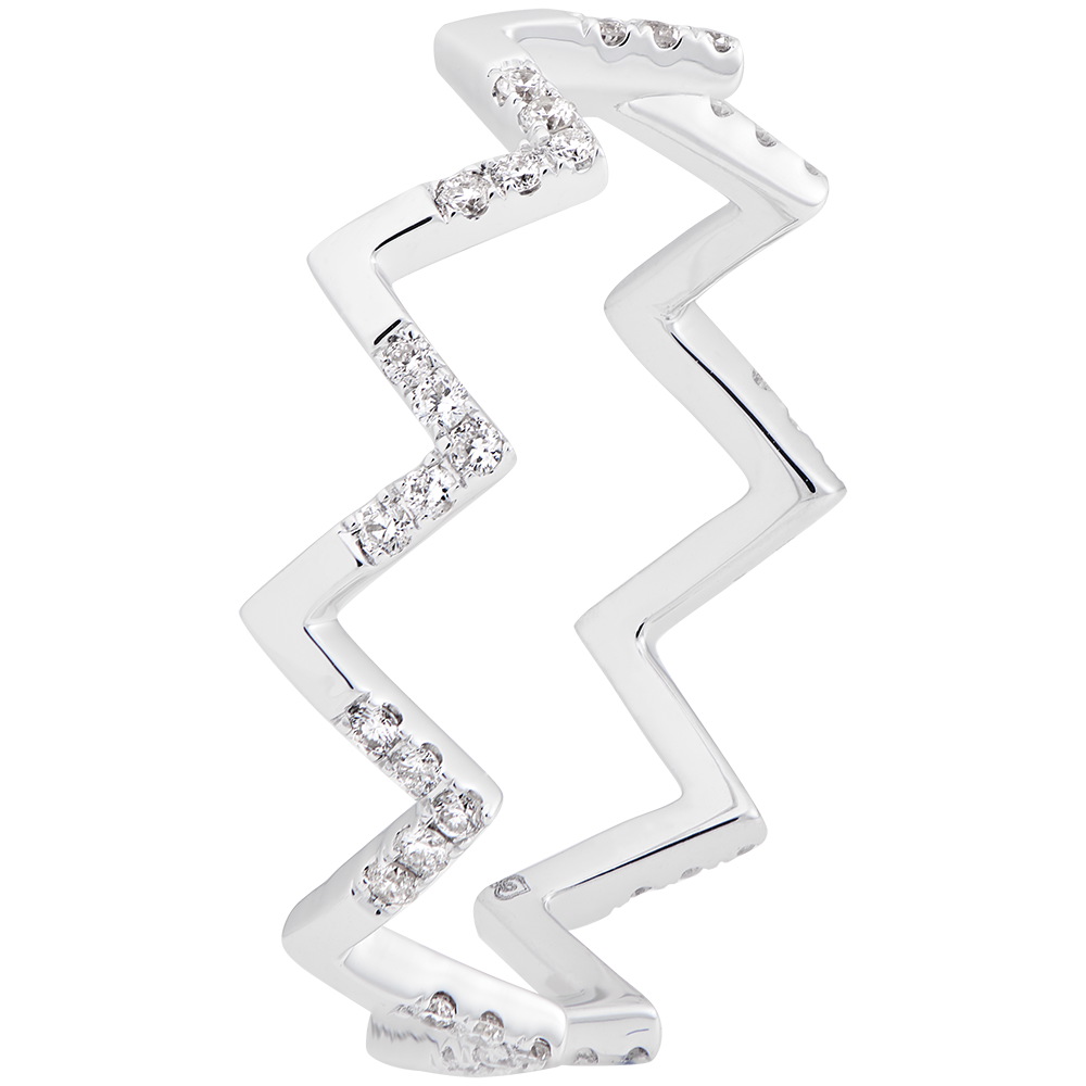 The Joe ring features a graphic design inspired by passion and freedom. Crafted in 18K white gold, it is set with 45 white diamonds totaling 0.16 carats, offering a subtle and refined sparkle.