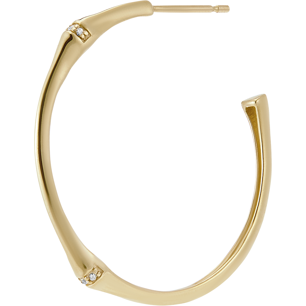 A branch of strong, supple bamboo metamorphoses into a pair of 30mm-diameter eternity earhoops. The bamboo knots are inlaid with diamonds in gold.