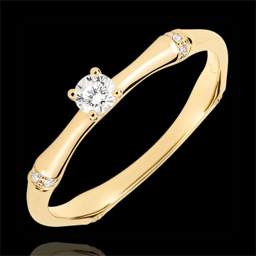 A strong and supple kind of bamboo which is fashioned into yellow gold eternal engagement ring. The nodes of the bamboo are encrusted with diamonds in yellow gold to highlight the diamond solitaire. Central stone 0.09 carats. 13 diamonds : 0.13 carat - Yellow gold (9K Gold = 375/-): 1.6 g. More dimensions