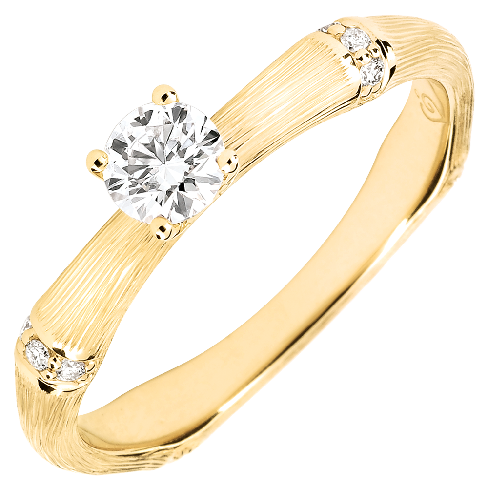 A strong and supple kind of bamboo which is fashioned into yellow gold eternal engagement ring. The nodes of the bamboo are encrusted with diamonds in brushed yellow gold to highlight the diamond solitaire. The finishing work. done entirely by hand. gives it a natural photo realistic look.…