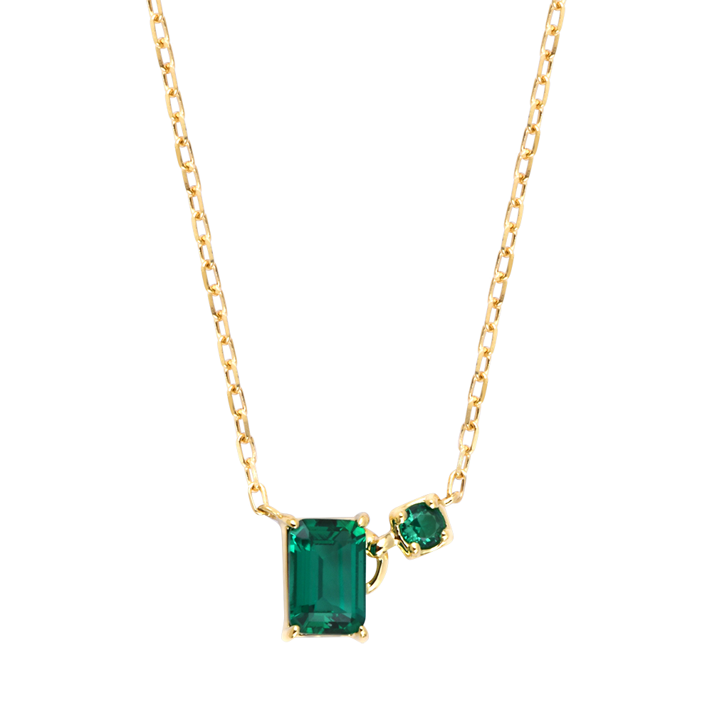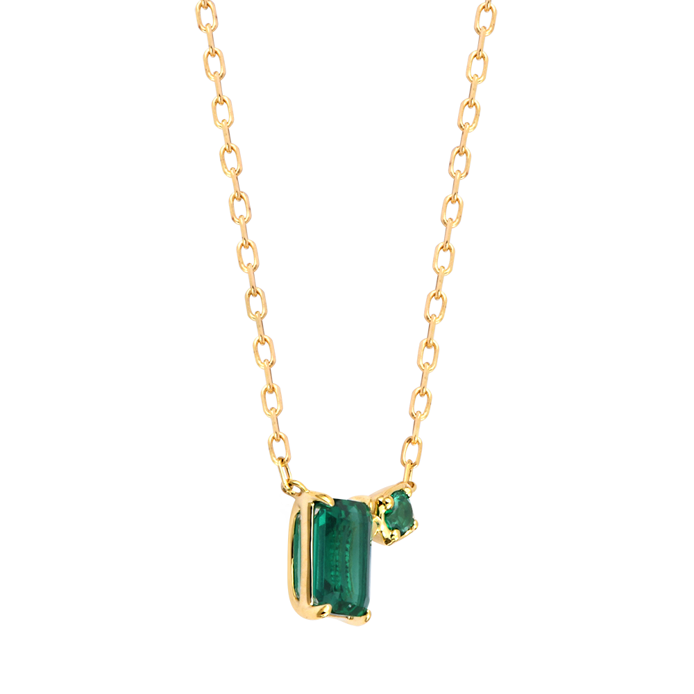 The Liora necklace features two synthetic emeralds cut in emerald shape, including a 0.8-carat stone paired with a smaller one, creating a vibrant asymmetric balance.