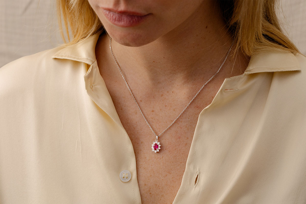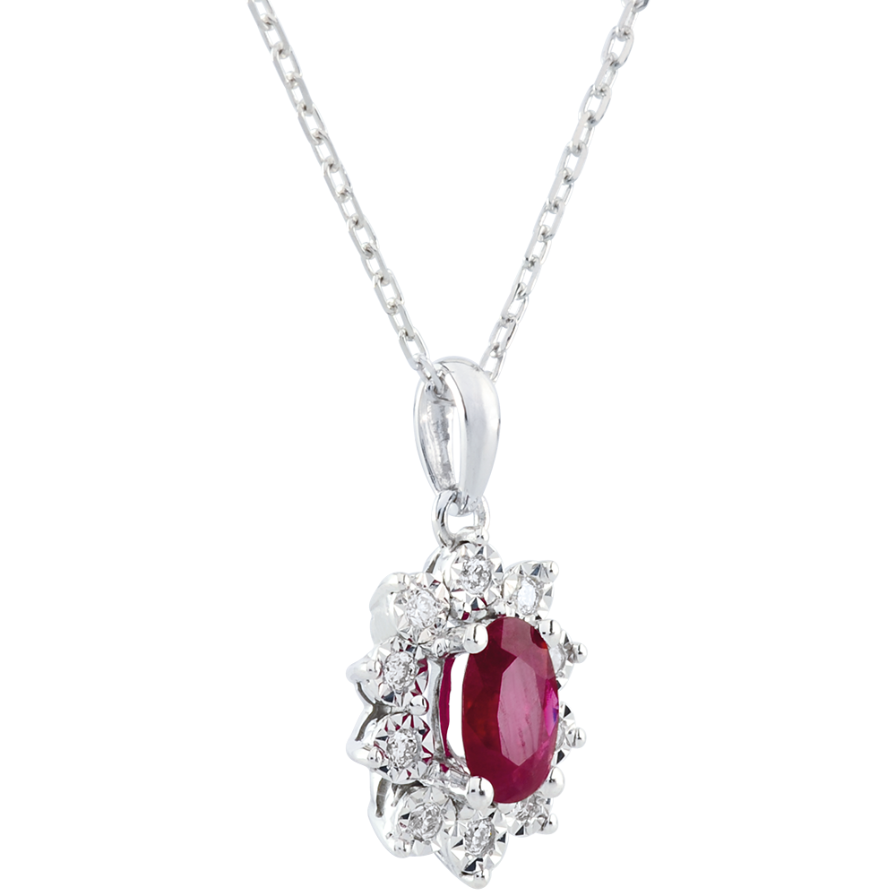 An oval ruby is the center of a white gold daisy which petals are made of diamonds.