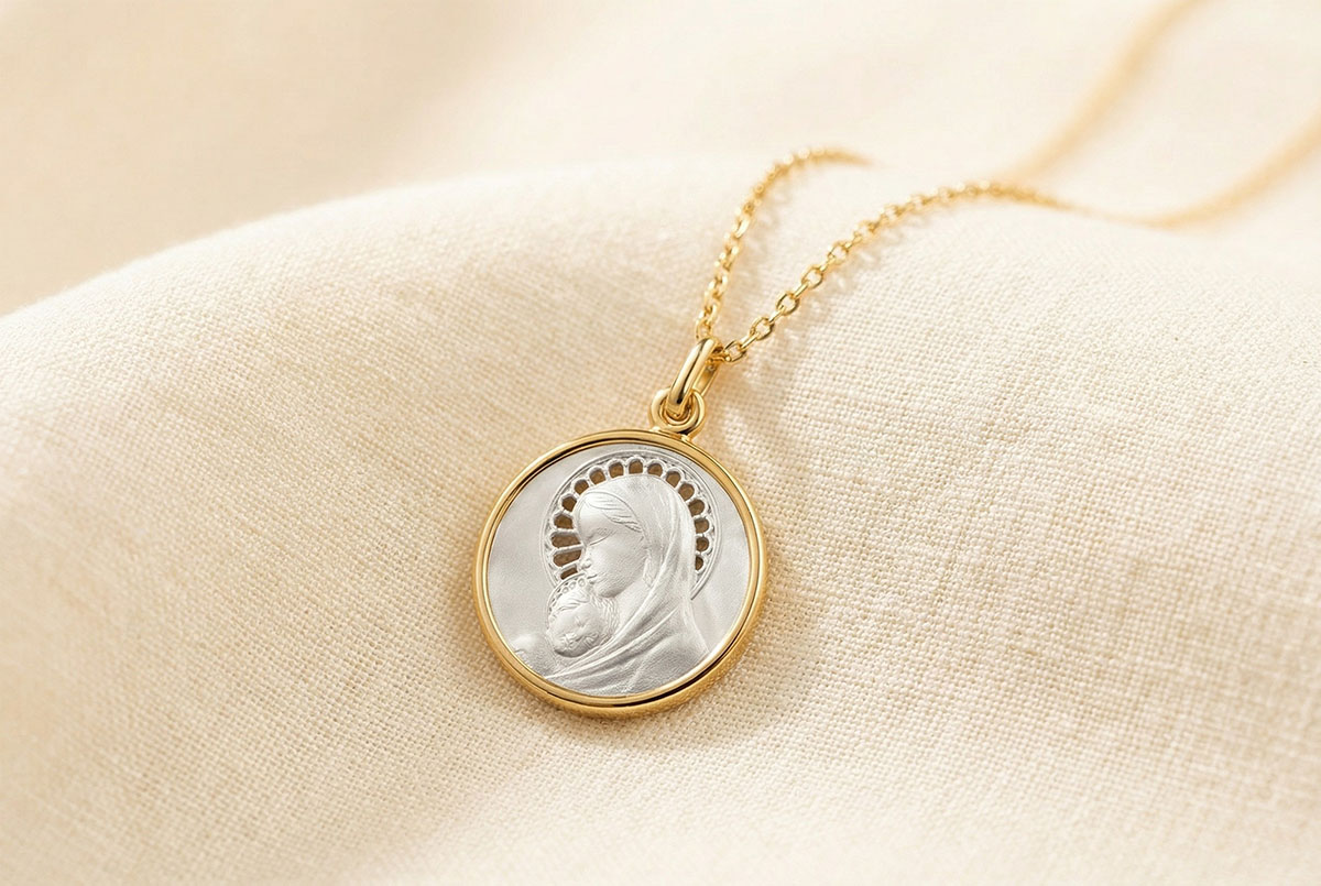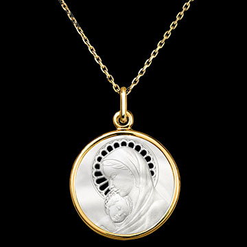 This medal, crafted in yellow gold and mother-of-pearl, depicts the Virgin Mary tenderly holding the Child Jesus. The delicate iconography is enhanced by a pierced mother-of-pearl halo, adding lightness and a touch of elegance. This piece, symbolising purity and gentleness, is perfect for honouring a spiritual occasion such as a baptism or communion.