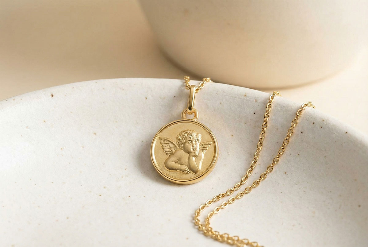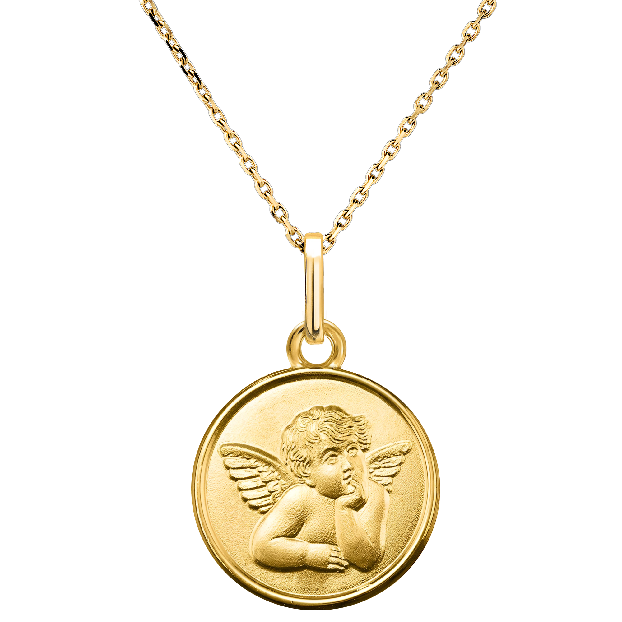 Inspired by Raphael's fresco, this finely crafted medal features a pensive angel, symbolizing gentleness, reflection, and protection. Material: 9ct Yellow Gold. Diameter: 14 mm. Finish: Sandblasted relief with polished gold border. Customizable engraving on the back. Delivered in a refined case, ready to gift for a christening or a birth. Without chain. Yellow gold (9K Gold = 375/-): 1 g. More dimensions