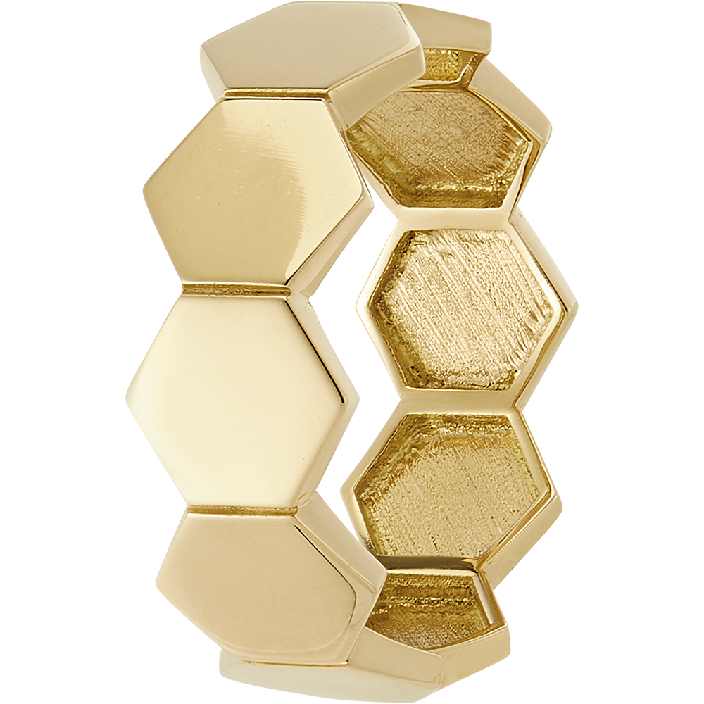 Let yourself be charmed by the subtle elegance of the all-gold Revelation Man ring, an exceptional piece inspired by the precious craftmanship of bees. It is composed of a row of solid honeycomb cells that spectacularly capture the light.