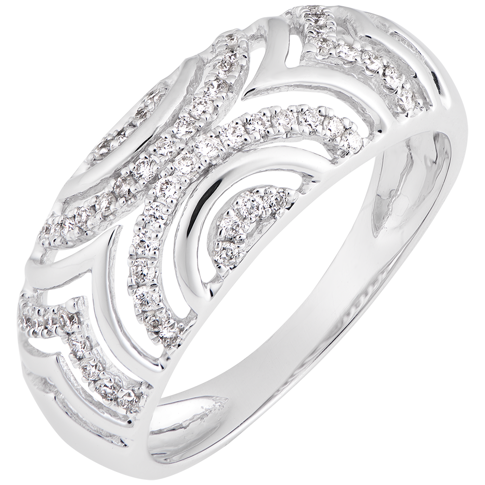 A curved and perforated ring, with art deco motifs paved with diamonds,revisiting the retro style code with balance. A timeless grace.