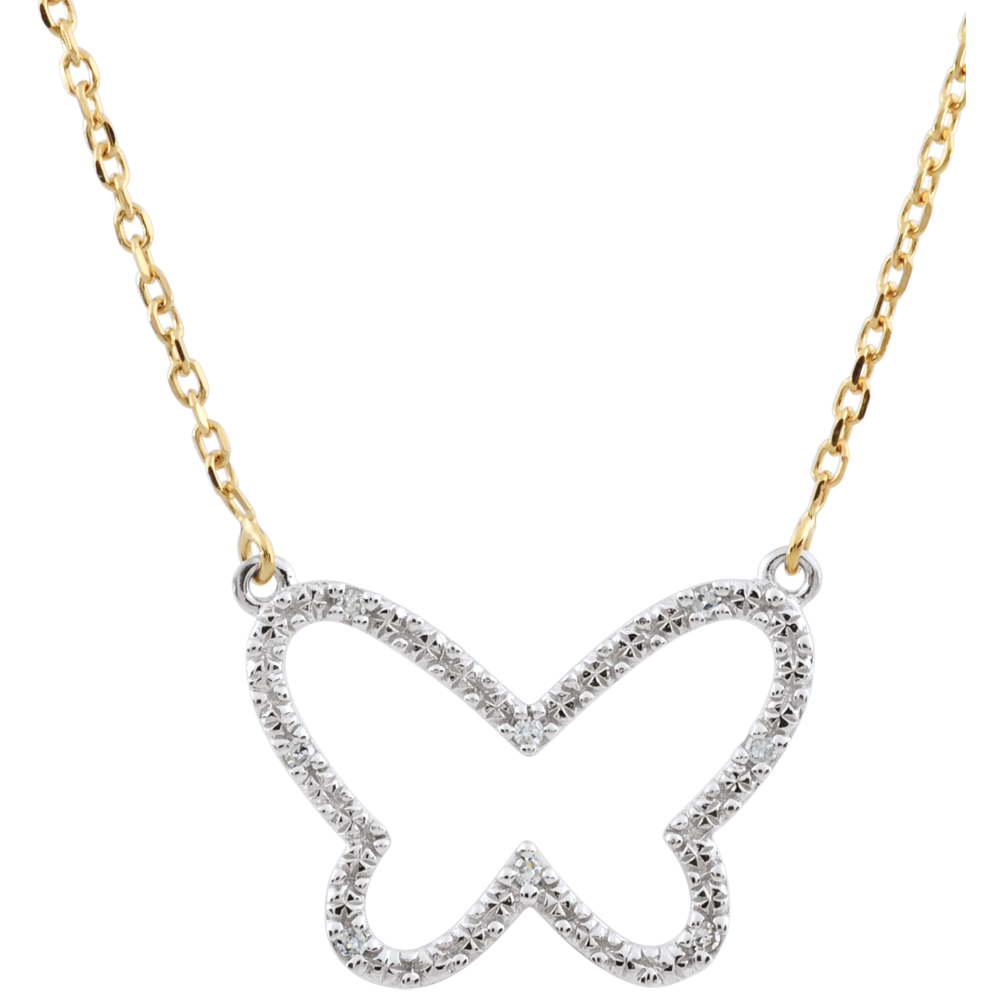 A gold and diamond butterfly emerges in outline at the end of a gold chain With gold chain 375/- . 8 diamonds : 0.03 carat - White and Yellow Gold (9K Gold = 375/-): 1.9 g. More dimensions