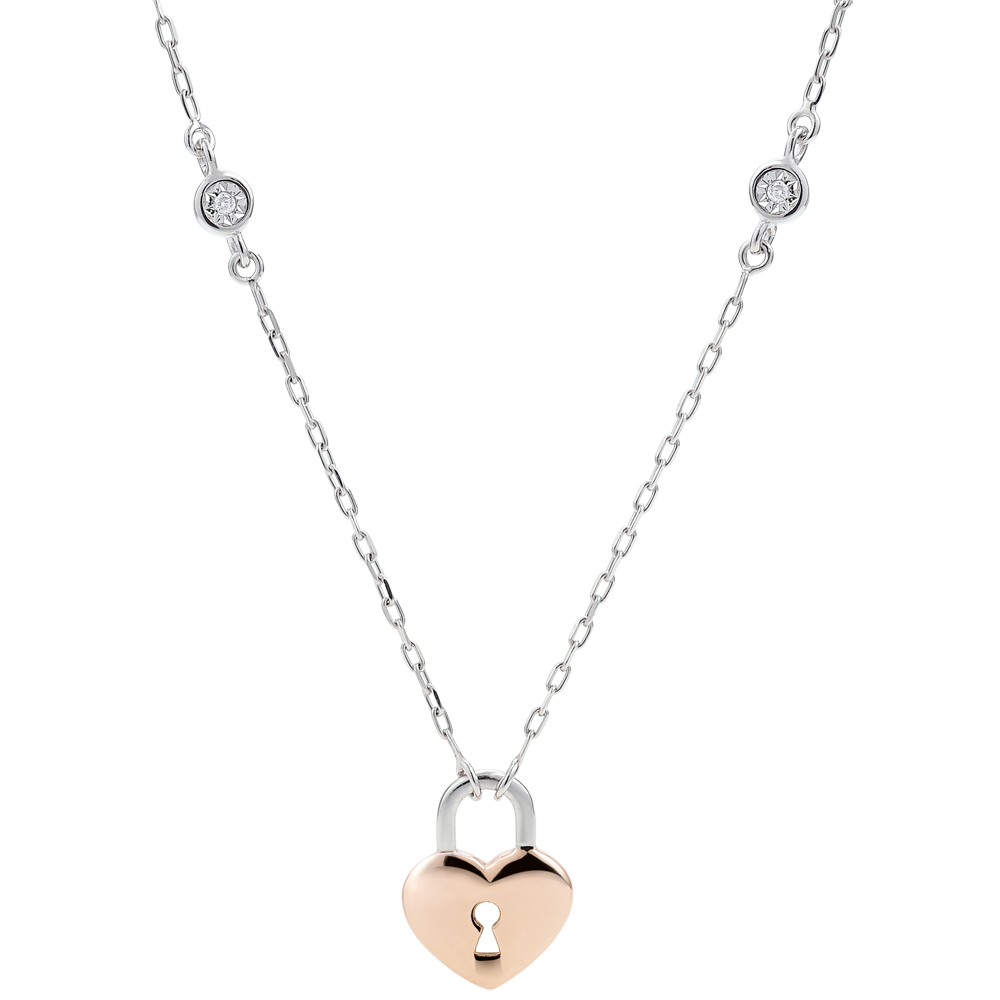 A heart necklace in rose gold bearing a lock is mounted on a white gold chain covered with two diamonds.