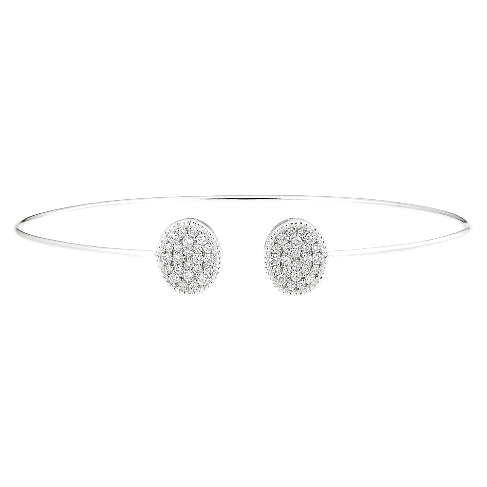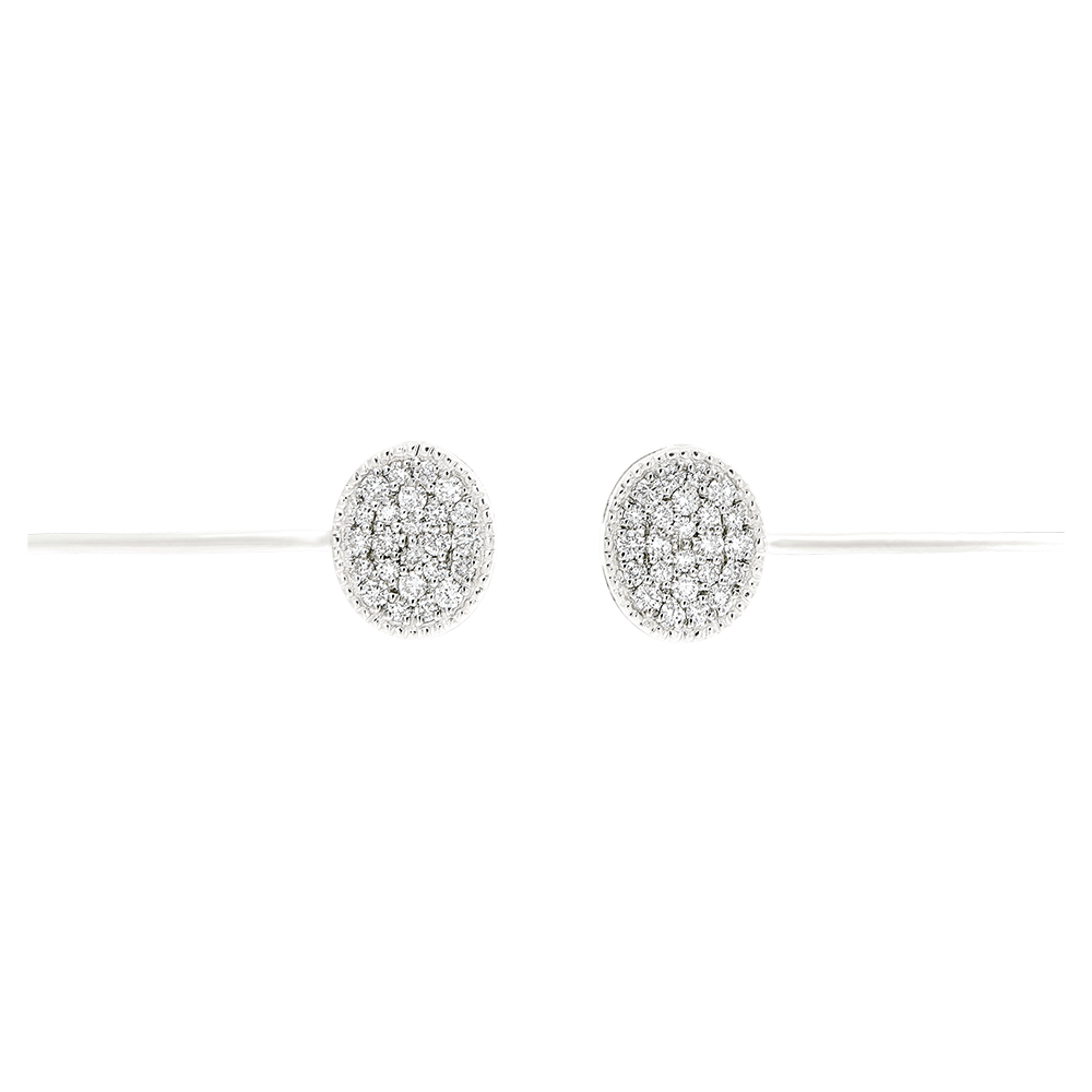 The radiance of two sophisticated diamond-paved ellipses on a delicate white gold bangle bracelet.