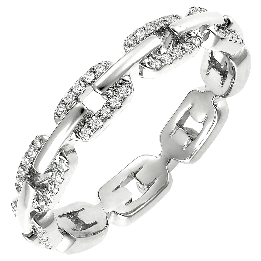 Generous white gold Cuban links set with diamonds constrast for an updated classic ring.