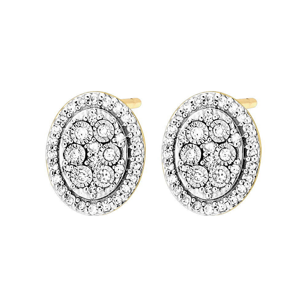The brilliance of oval pavé diamond earrings, crowned with a diamond halo. A pair of fine and delicate white and yellow gold studs, marked by timeless elegance. 76 diamonds : 0.17 carat - White and Yellow Gold (18K Gold = 750/-): 1.5 g. Cluster of natural diamonds : 76 - Diamond white - Total: 0.165 carat More dimensions