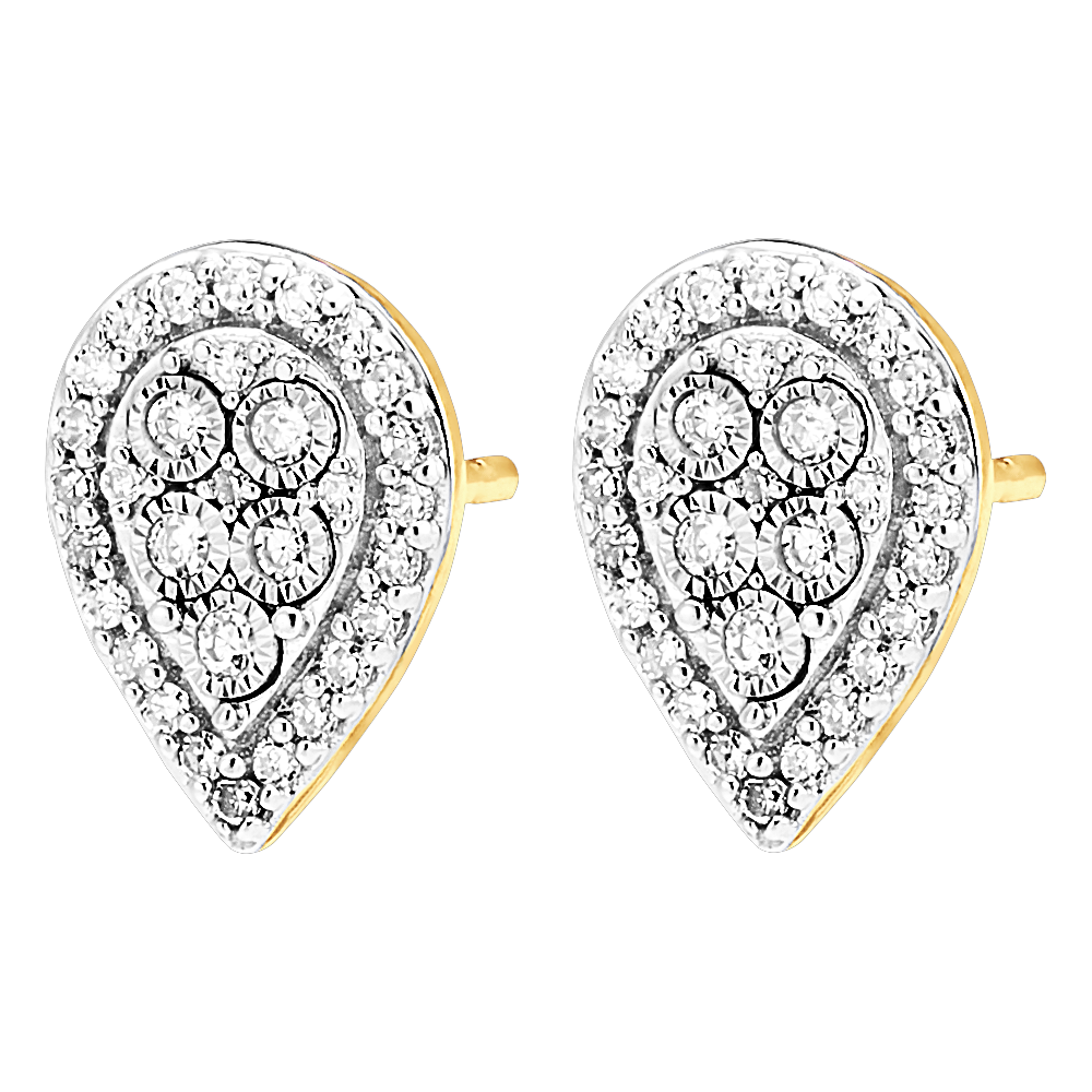 The brilliance of pear-shaped pavé diamond earrings, crowned with a diamond halo. A pair of fine and delicate white and yellow gold studs, marked by timeless elegance. 62 diamonds : 0.16 carat - White and Yellow Gold (18K Gold = 750/-): 1.7 g. Cluster of natural diamonds : 62 - Diamond white - Total: 0.155 carat More dimensions