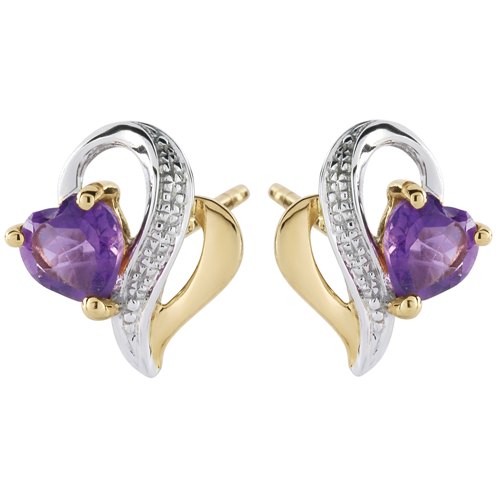 Romantic gold half hoops intertwine two heart-shaped amethysts .