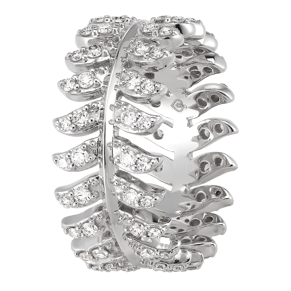 The Révérence ring in 18-carat white gold is distinguished by its circular feather motif delicately set with 50 synthetic diamonds. Reflecting the majestic spirit of the Panache collection, this ring is an example of refinement and brilliance, ideal for adding a touch of sparkle to your hand. White gold (18K Gold = 750/-): 6.8 g. Laboratory Diamond : 80 - Total: 0.77 carat More dimensions