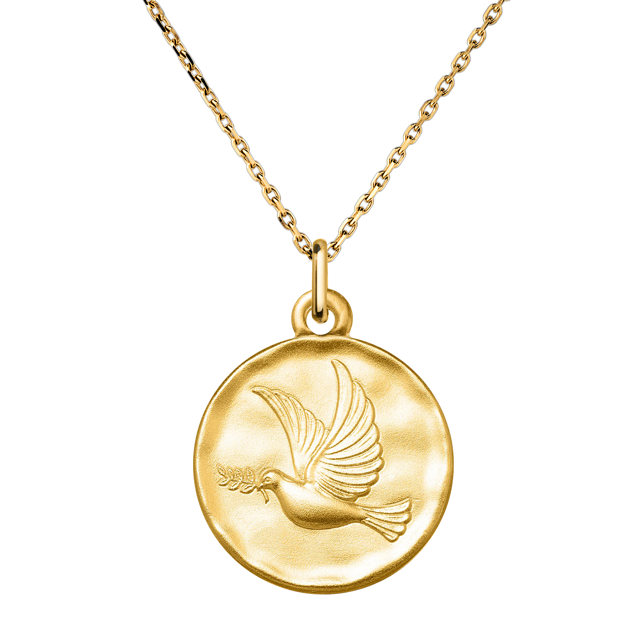 This 18-carat yellow gold medal features a dove carrying an olive branch, a universal symbol of peace, reconciliation, and harmony. Its delicately sculpted design conveys a timeless and meaningful message.