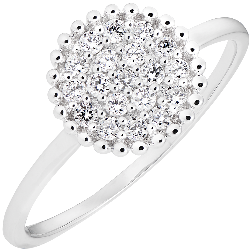A fine and sparkling ring thanks to its concentric paving of diamonds. 19 diamonds : 0.21 carat - White gold (9K Gold = 375/-): 1.5 g. Cluster of natural diamonds : 19 - More dimensions