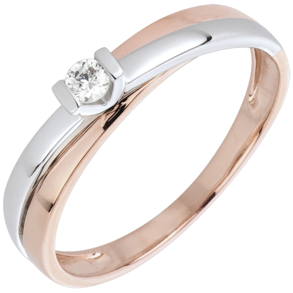 A modern setting with a solitaire mounted on a double ring in rose and white gold.