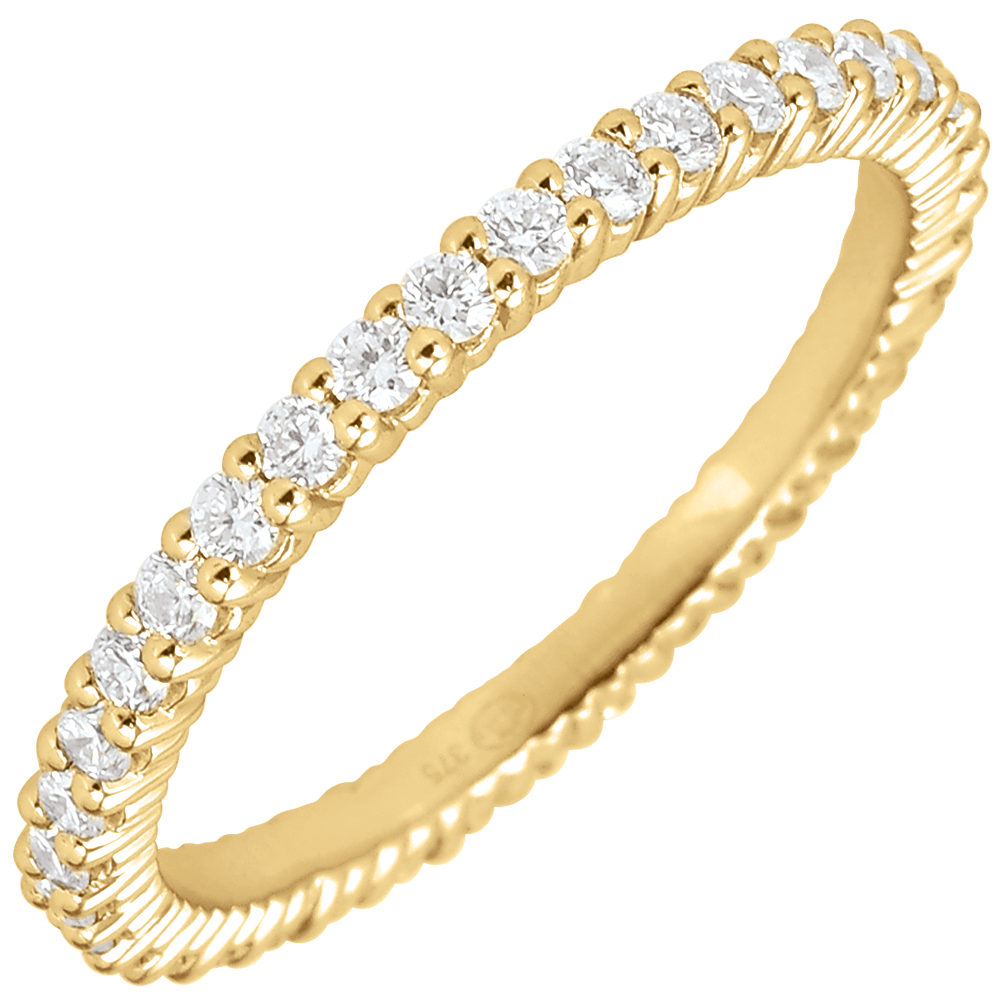 This elegant yellow gold wedding band is completely inlaid with 38 exceptional diamonds. This timeless wedding band is the perfect companion for any type of engagement ring or it can be worn on its own. 38 diamonds : 0.57 carat - Yellow gold (9K Gold = 375/-): 1.4 g. More dimensions