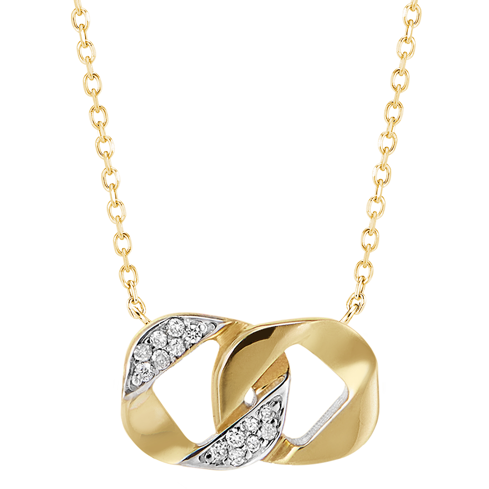 A duo of yellow gold and diamond-set gourmette links placed on a delicate chain for a classic necklace. Chain length 45cm and adjustment ring at 42cm. With gold chain 750/- . 14 diamonds : 0.04 carat - Yellow gold (18K Gold = 750/-): 2.1 g. More dimensions