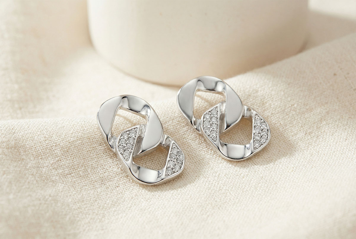 A pair of white gold stud earrings consisting of two curb chain links, one of which is set with diamonds.