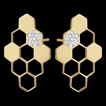 Each earring is a masterpiece, meticulously crafted from finely worked gold, with 3 honeycomb cells filled with gold and studded with 13 sparkling diamonds.